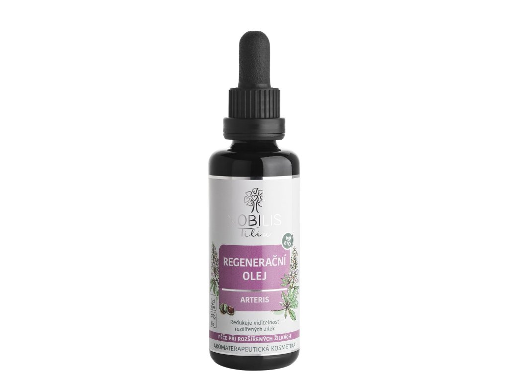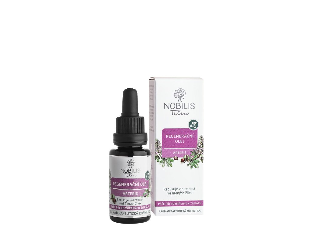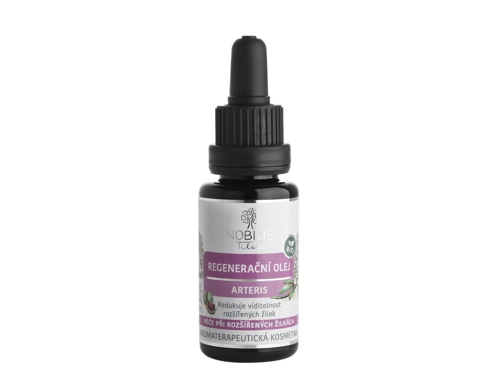 REGENERAČNÍ OLEJ ARTERIS je pečlivě vyvážená směs bio panenských rostlinných olejů ( mandlový olej, bio šípkový a jojobový olej ) , bylinných extraktů a aromaterapeutických éterických olejů, která přináší jemnou, ale účinnou péči o citlivou pleť, kterou trápí časté rozšíření žilky, kuperóza či rosacea. Pleť nezatěžuje a po aplikaci může pleť volně „dýchat“ – olej je vhodný jako noční omlazující sérum nebo doplněk ranní péče, především v období chladnějších měsíců, kdy citlivá kůže potřebuje více ochrany. Pleť zklidňuje, hydratuje, přispívá k její rovnováze a pomáhá jí vypadat zdravěji a sjednoceněji.